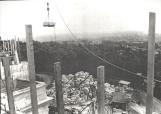 Sur le flanc du mont Royal on aperçoit le chantier de construction de l'Oratoire. Les blocs de granit sont soulevés dans les airs à l'aide de grues. Ces blocs étaient transportés par tain jusqu'à Montréal.