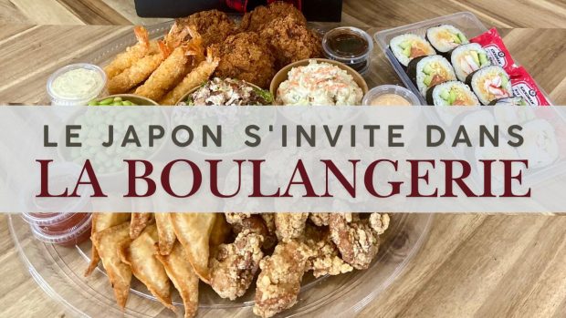 Vue en plongée d'une douzaine de wontons frits triangulaires et de quatre crevettes frites panées à la japonaise. Les items sont disposés dans un contenant rectangulaire en plastique transparent. En bas du plat, il y a deux petits pots de sauce : une sauce chili douce rouge et une sauce foncée (probablement soya ou prune). L'ensemble repose sur une surface en bois clair.