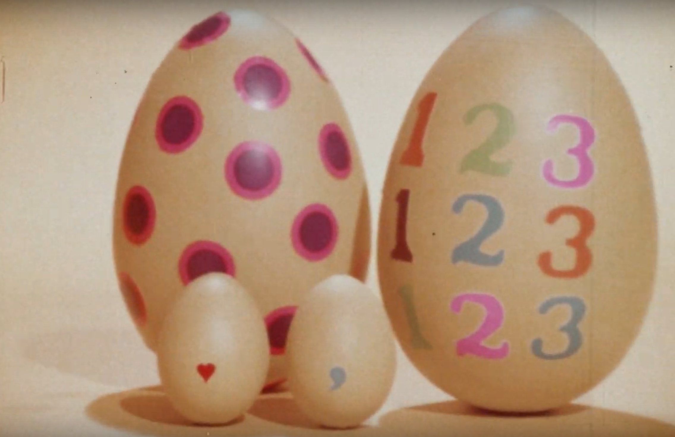 [Calming background music plays while female narrator speaks. Camera pans out of a still image of 10 colourfully decorated eggs.] No two of us are exactly alike and no one birth control method is just right for everyone. [Camera pans across a still image of 2 large colourfully decorated eggs beside 2 small eggs.] There are several family planning methods that work very well. [Camera pans across a still image of 2 large colourfully decorated eggs beside 6 small eggs.] And some that don't work very well at all. [Fades into a still image of a large decorated egg beside a small egg, then fades and camera pans into a still image of an egg wearing a head mirror and an egg wearing a nursing cap.] You can get help in choosing a birth control method that is safe, reliable, inexpensive, and just right for you. [Contact information for Planned Parenthood of New York City appears.]