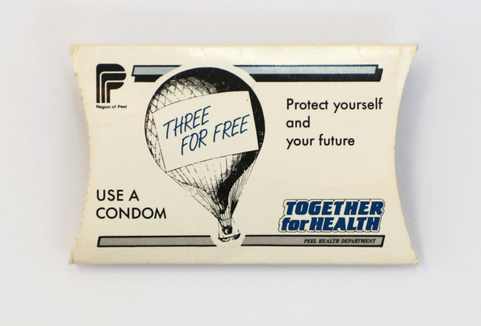 This paper packet contained three packaged condoms. It was handed out by the Peel Public Health Department to promote safer sex.