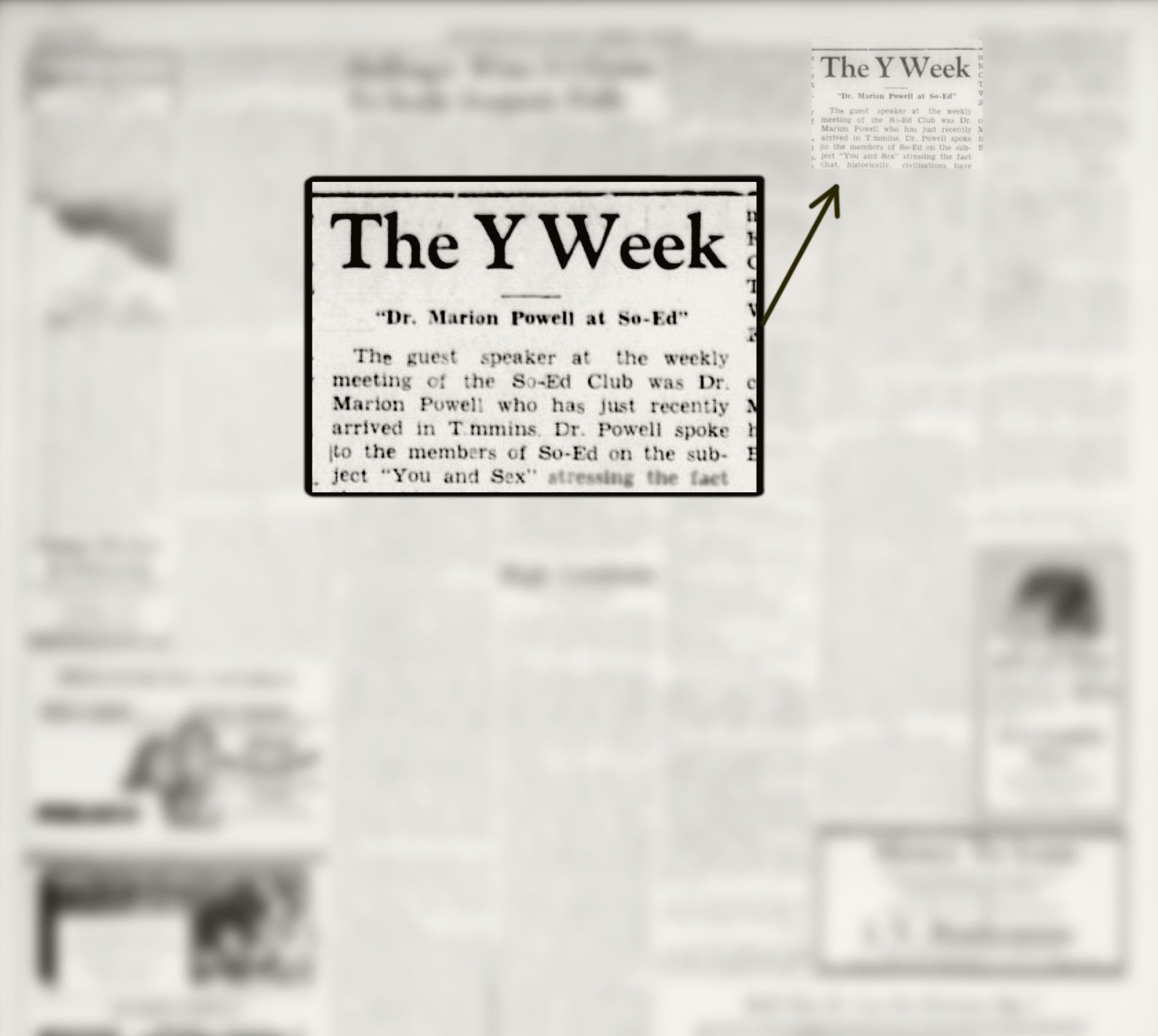 The article printed in the Porcupine Advance reads: “The Y Week – Dr. Marion Powell at So-Ed. The guest speaker at the weekly meeting of the So-Ed Club was Dr. Marion Powell who has just recently arrived in Timmins. Dr. Powell spoke to the members of So-Ed on the subject You and Sex.”