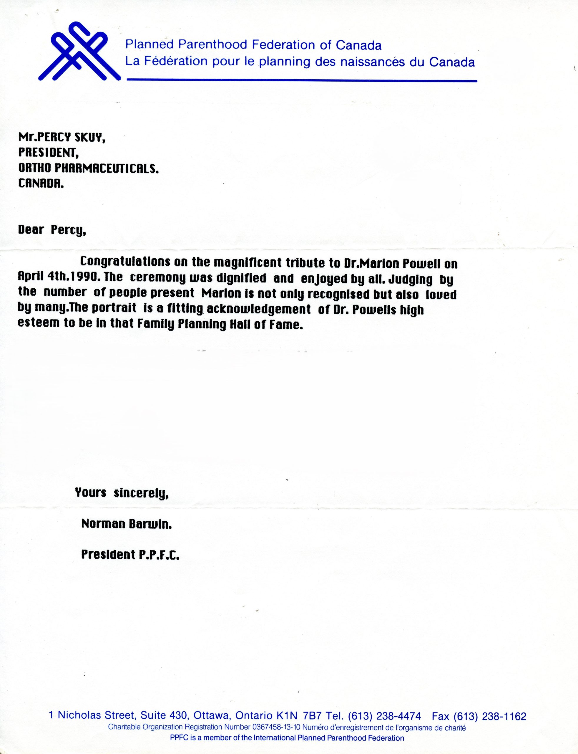 Cette lettre fut écrite par Norman Barwin, président de la Fédération de la planification familiale du Canada, pour féliciter Percy Skuy, président d’Ortho Pharmaceutical Canada, d’avoir rendu hommage à la Dre Marion Powell au Temple de la renommée de la planification familiale.
